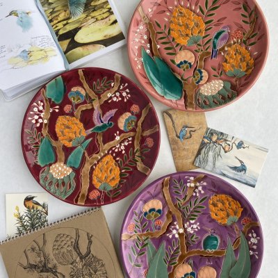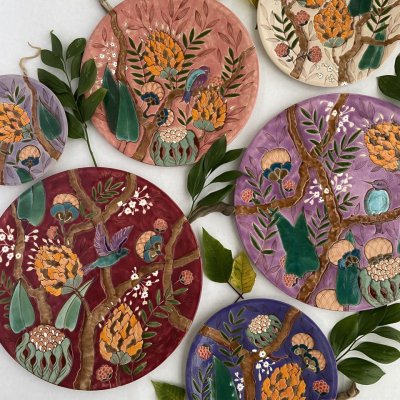 Керамическая тарелка полностью ручной работы с тропическими мотивами.