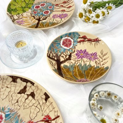 Керамическая тарелка полностью ручной работы с тропическими мотивами.